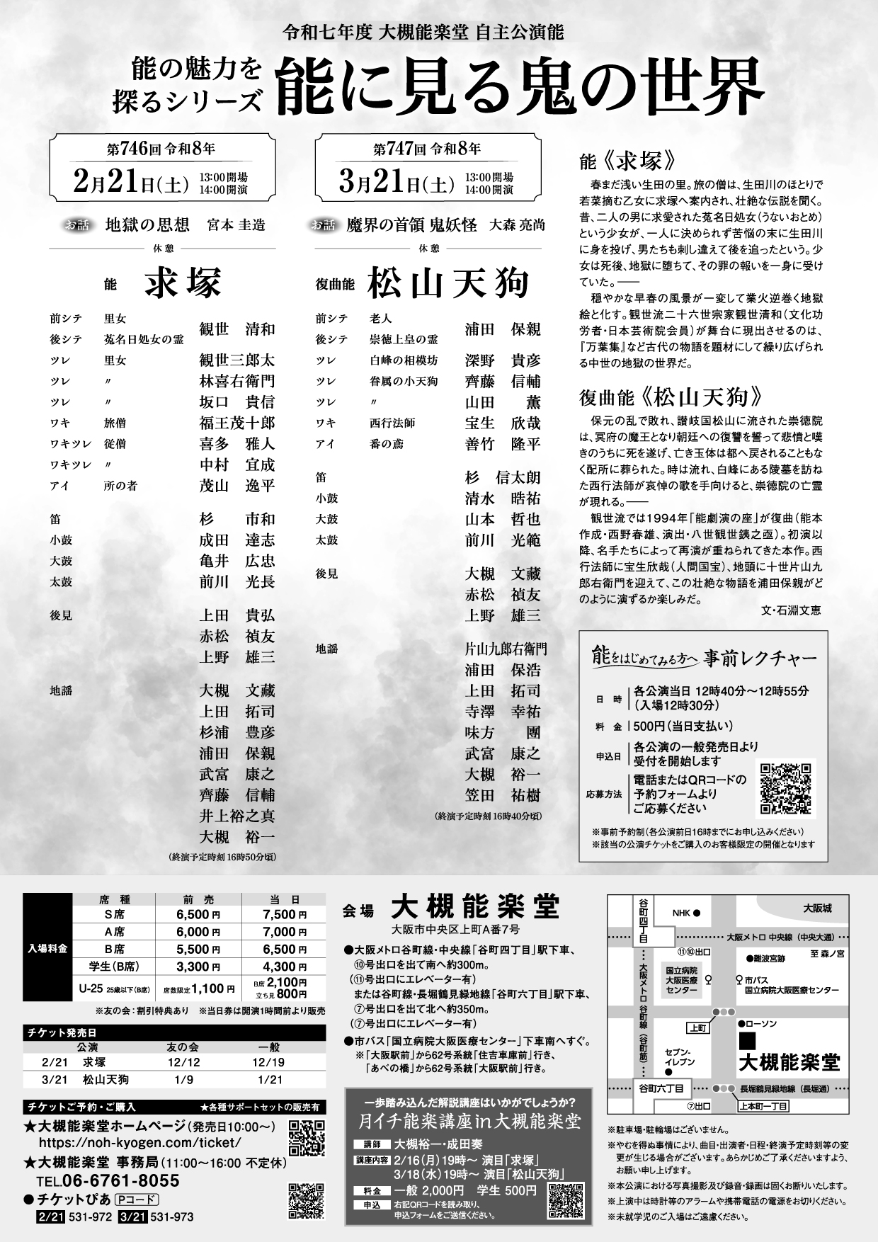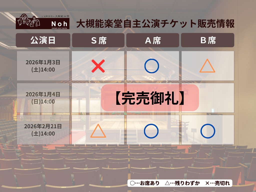 現在、販売しております大槻能楽堂主催公演(自主公演)のチケット最新情報をお知らせします。