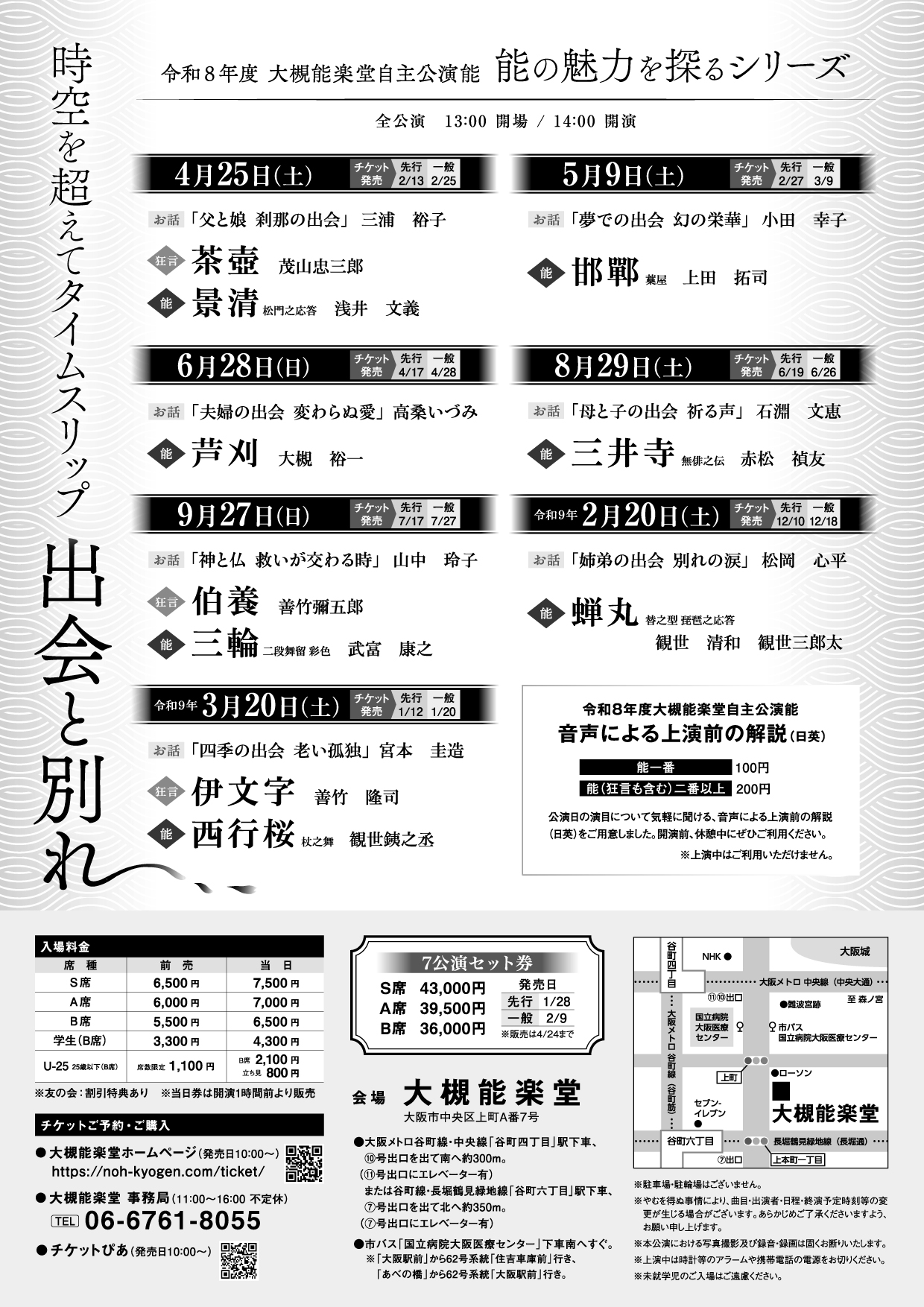 能の魅力を探るシリーズ「時空を超えてタイムスリップ 出会と別れ」全7公演のセット券を販売します。