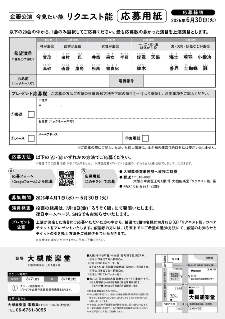 企画公演「今見たい能 リクエスト能」の募集を開始いたします。