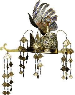 Headwear (kanmuri) include court caps indicating rank; headdresses with figures of cranes, turtles, and herons which represent the character; headdresses sporting dragons and foxes that stand for messengers of gods; headpieces with a tiger which symbolize beasts; and crowns with dangling ornaments (tenkan) signifying celestial maidens.