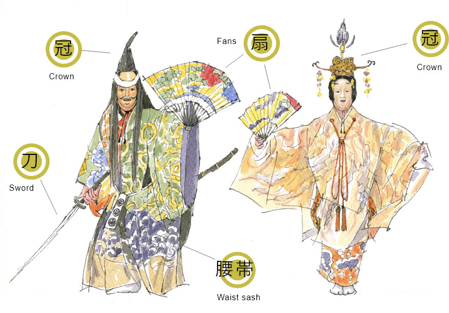 indicate a character’s detailed feature and status.In addition to the noh masks and garments, various accessories are used to create the image of a noh character.