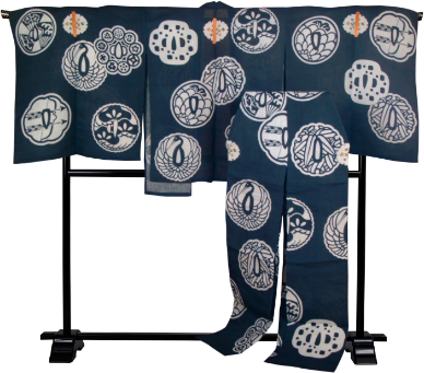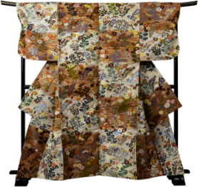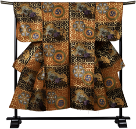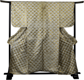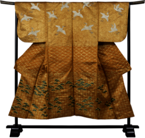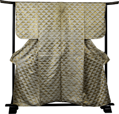 Types of Costume - The decorative techniques used to make noh costumes are patterned weaving, embroidery, and stenciled gold foil. In making these costumes, the threads are dyed before being woven into fabric. Only a few costumes, like the matching bast-fiber suits known as hitatare and suo, use surface-dye techniques.