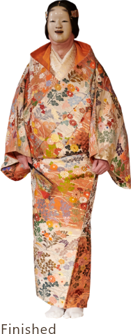 In Noh, only a minimum of necessary items are placed symbolically on the stage. In contrast to the simplicity of the stage props, the noh costumes are lavish.