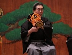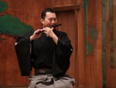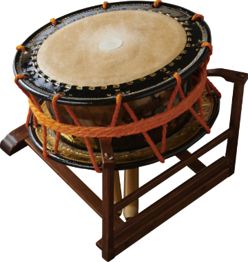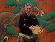 The hayashi ensemble consists of just one melodic instrument, the noh flute (fue), and three drums: the small hand drum or shoulder drum (kotsuzumi), the larger hand drum or hip drum (otuszumi), and the stick drum (taiko).